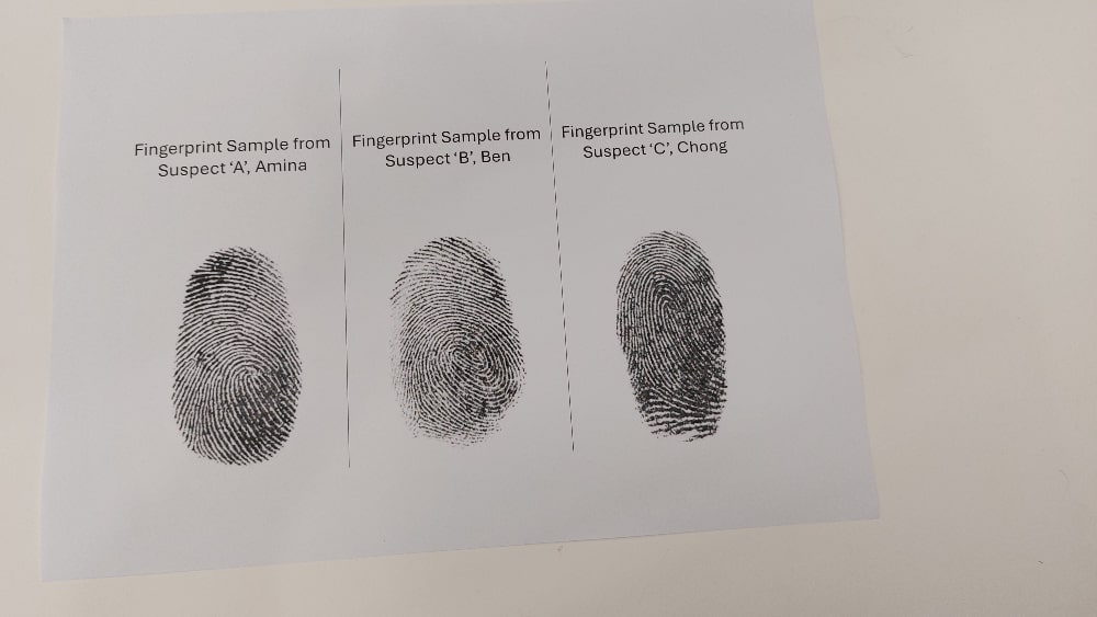 At the Fingerprint Station, fingerprints collected from the suspects were compared to those lifted from a half empty cigarette packet collected at the scene. There was blood spatter on top of it, suggesting it was thrown against the wall before the victim was killed.